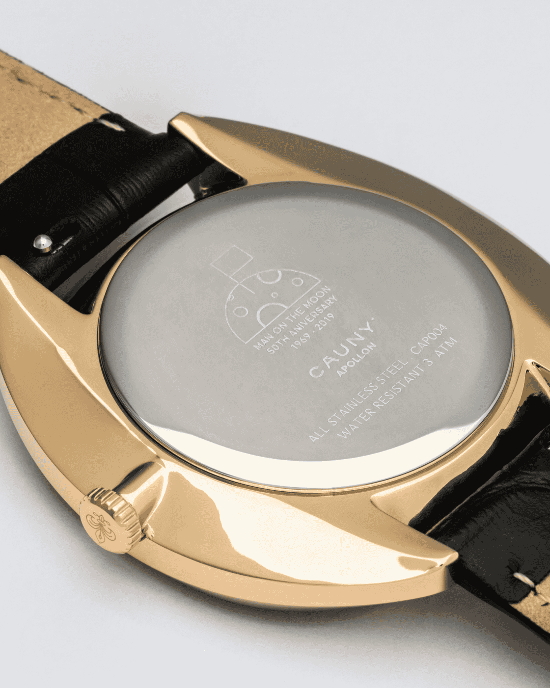 Una reinterpretación de un clásico de los 70, el Cauny Apollon conserva el característico diseño de caja, inspirado en los televisores que mostraban el alunizaje. Actualizado con materiales modernos, esta versión contrasta la correa y la esfera completamente negras con tonos dorados y un segundero rojo. ¡Audaz pero discreto!