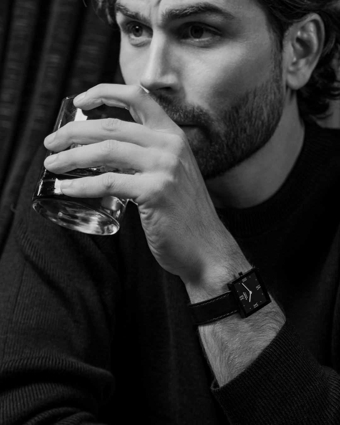 Al diseñar su primer reloj de pulsera, Rafael Moneo se inspiró en los dos relojes que había diseñado para las torres de Logroño y la Estación de Atocha. El resultado fue un reloj sencillo pero diferente. El brazalete se integra en la caja, garantizando un cuadrado perfecto, mientras que los altos y finos números romanos se utilizan para representar el tiempo como etapas del día. Si buscas un reloj diferente y a la vez sobrio, esta versión en negro es para ti.
