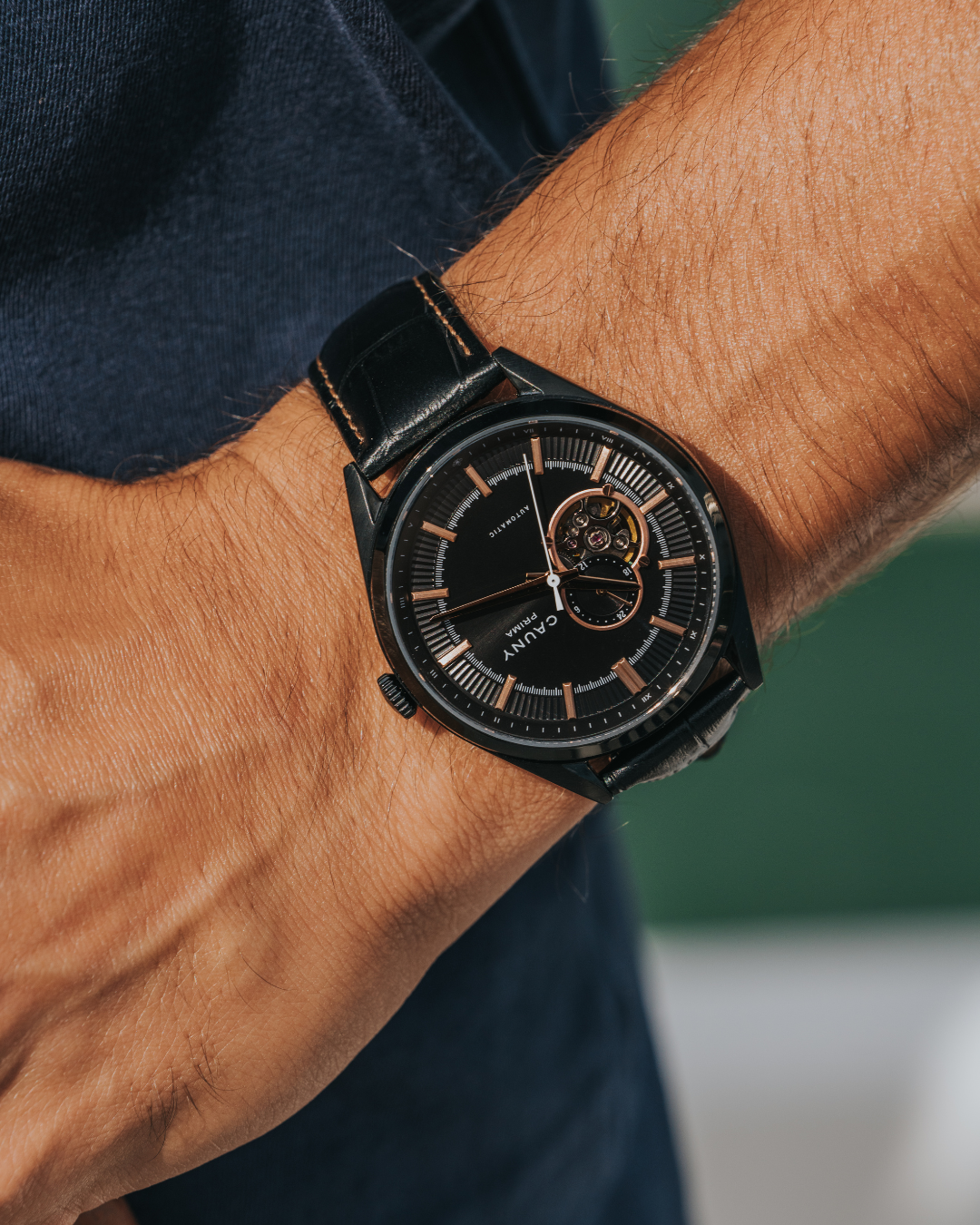 Diseñado en tonos negros, el Cauny Prima Open Heart Black destaca por su elegante simplicidad. Con una correa de piel italiana auténtica negra y una esfera negra con apertura Open Heart, este reloj automático con cristal de zafiro es el complemento perfecto para cualquier situación o estado de ánimo.