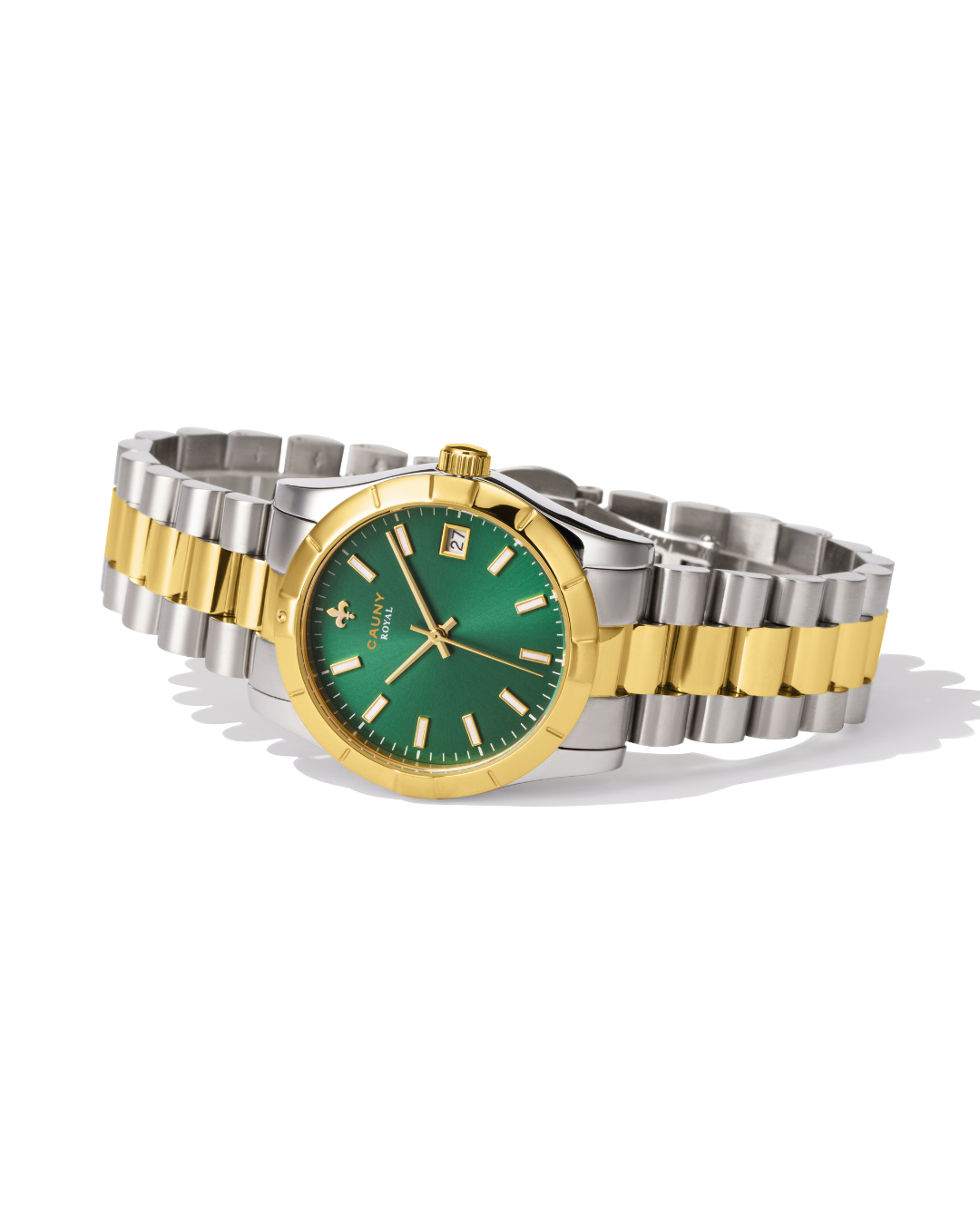 Con la flor de lis de Cauny incrustada en la esfera, índices con interiores de nácar, brazalete de acero y proporciones modernas, el Cauny Royal es el accesorio perfecto para la mujer moderna. Esta versión, que combina una esfera verde con brazalete y caja bicolor, es testimonio de nuestro compromiso con la elegancia contemporánea.