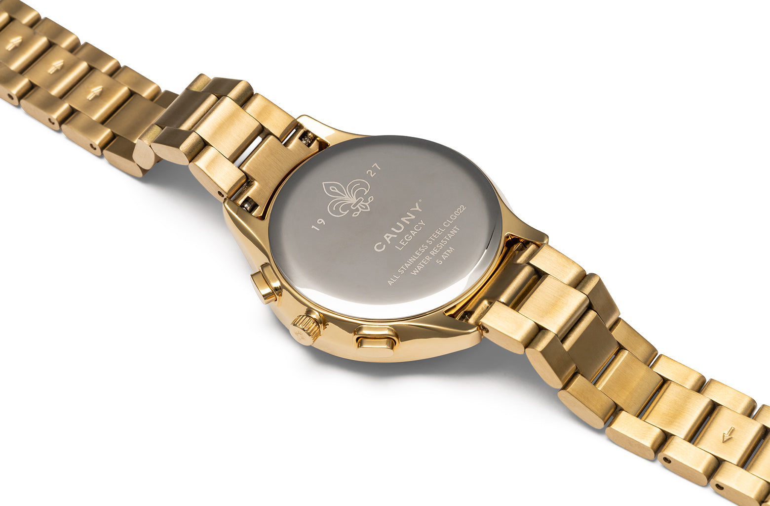 Ahora totalmente modernizada, nuestra colección Legacy para mujer cuenta con tres contadores y pulsadores laterales tradicionales. Con una esfera magenta intenso y caja y brazalete dorados, esta es una opción audaz y elegante. Un éxito de ventas de Cauny y un reloj que no querrás quitarte de la muñeca.