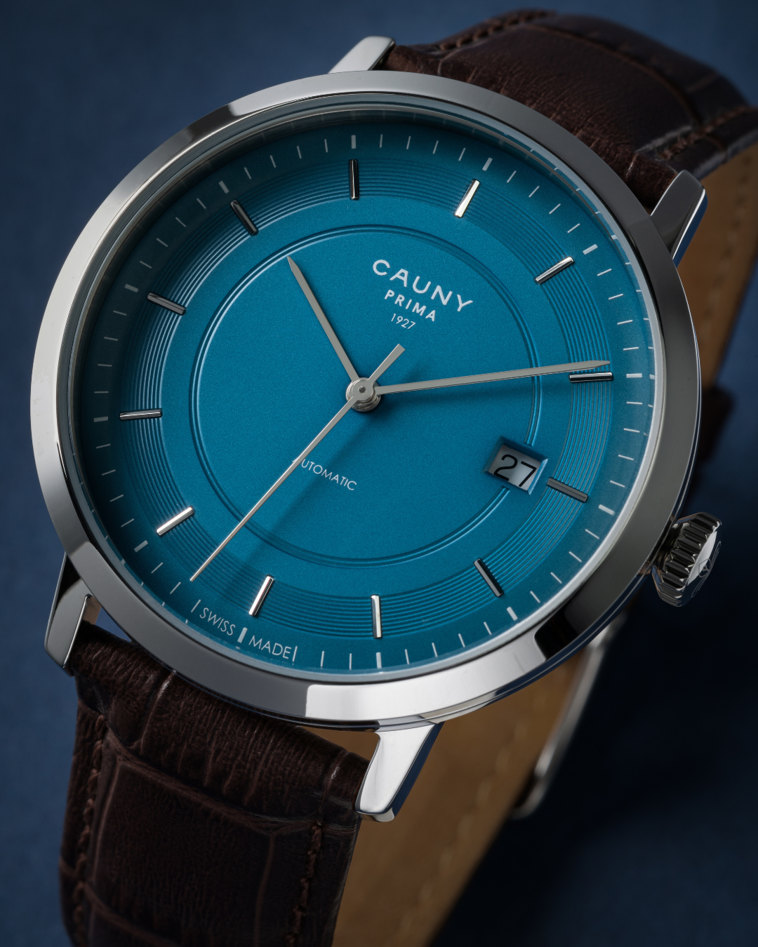 An absolute classic, the Cauny Prima is one of the most recognized models by watch lovers around the world. With high-quality automatic movements made in La Chaux-de-Fonds, the city where the brand was born in 1927, the Automatic Blue Axis combines a chocolate alligator-pattern leather strap with a blue dial with silver details that harkens back to our heritage. A refined timepiece made for any enthusiast.