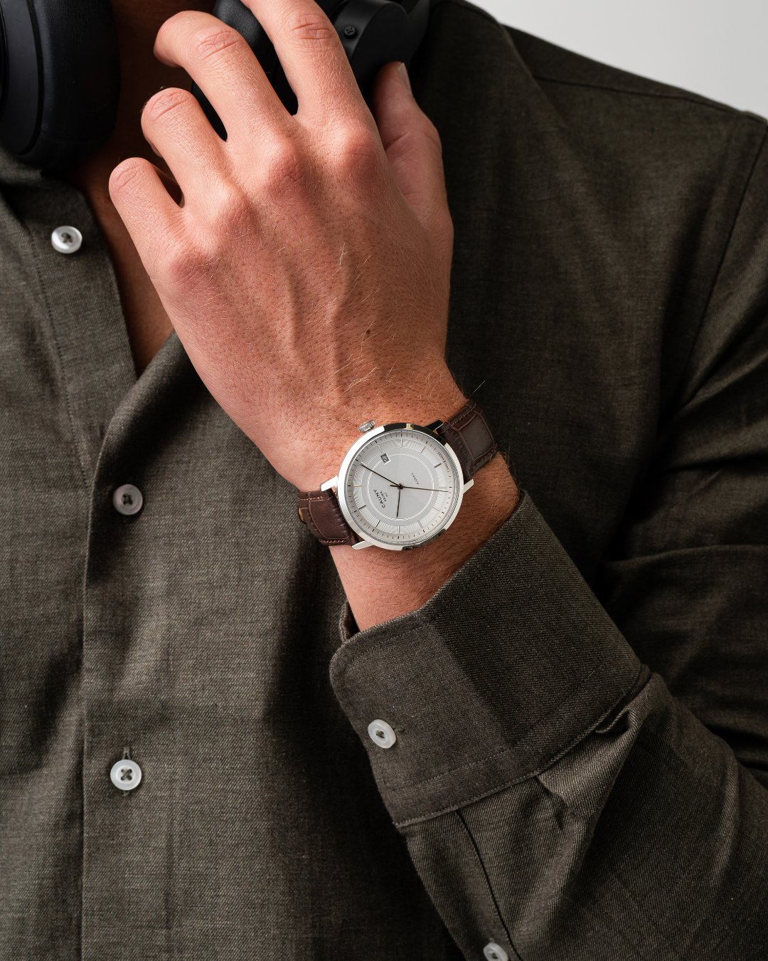 An absolute classic, the Cauny Prima is one of the most recognized models by watch lovers around the world. With high-quality automatic movements made in La Chaux-de-Fonds, the city where the brand was born in 1927, the Automatic Silver Axis features a chocolate alligator-pattern leather strap and a high-precision 316L steel case. A classic combination that led to the creation of a refined watch tailored for any enthusiast.