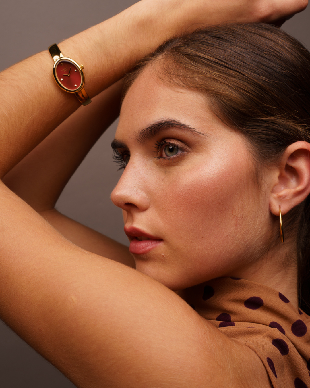 O Cauny Ambar combina a elegância da joalharia com o design contemporâneo de relógios, criando uma peça elegante que transmite a mesma sensação de preciosidade de um adorno pessoal. Na edição Borgonha, o mostrador contrasta com a bracelete dourada em forma de bagel e a caixa oval, acrescentando calor e uma sofisticação marcante.