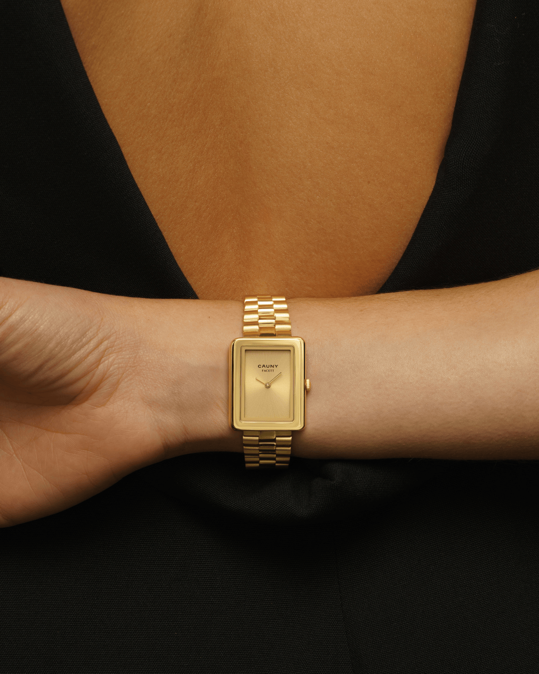 Tão sofisticado coo ousado, o Facett Gold é uma nova versão de um clássico da Cauny. Com uma caixa de aço 316L de alta precisão, um mostrador dourado com detalhes em ouro e uma elegante bracelete de aço banhada a ouro, ele prova que um relógio é também uma jóia.